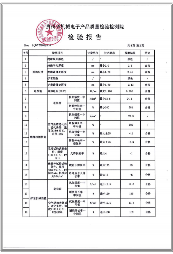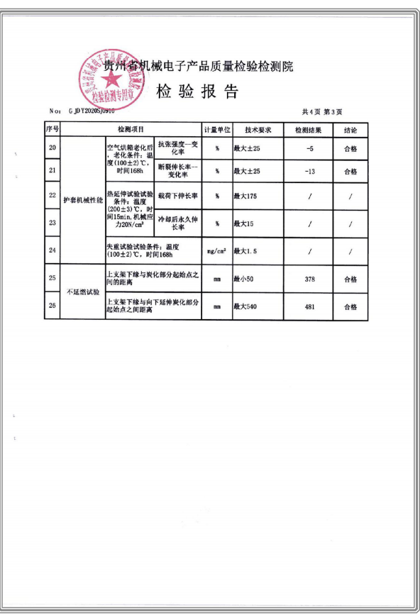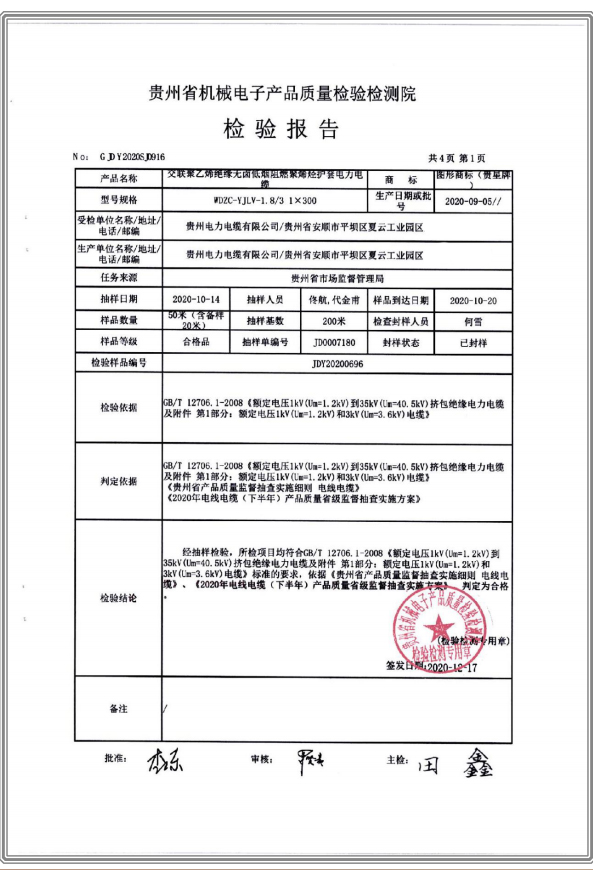 交聯(lián)聚乙烯絕緣無(wú)鹵低煙阻燃聚烯烴護(hù)套電力電纜 檢驗(yàn)報(bào)告