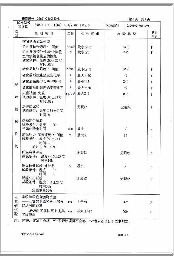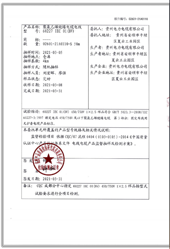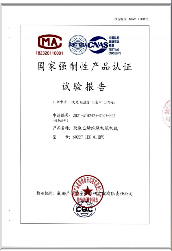 聚氯乙烯乙烯絕緣電纜電線 國家強(qiáng)制性產(chǎn)品試驗(yàn)認(rèn)證報(bào)告